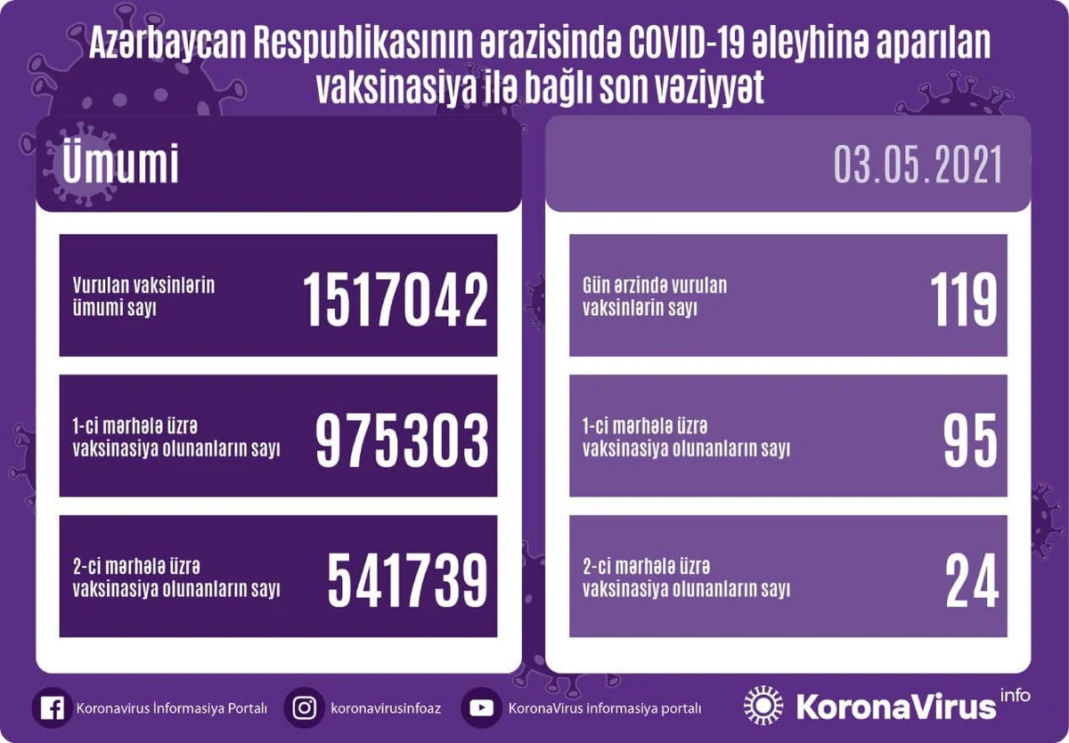 Azərbaycanda bu günə qədər vurulan vaksinlərin ümumi sayı 1 517 042, birinci mərhələ üzrə peyvənd olunanların ümumi sayı 975 303, ikinci mərhələ üzrə vaksinasiya edilənlərin sayı 541 739 nəfər təşkil edir.