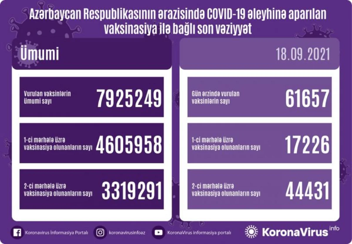 Azərbaycanda bu günə qədər vurulan vaksinlərin ümumi sayı 7 925 249, birinci mərhələ üzrə peyvənd olunanların ümumi sayı 4 605 958, ikinci mərhələ üzrə vaksinasiya edilənlərin sayı 3 319 291 nəfər təşkil edir.