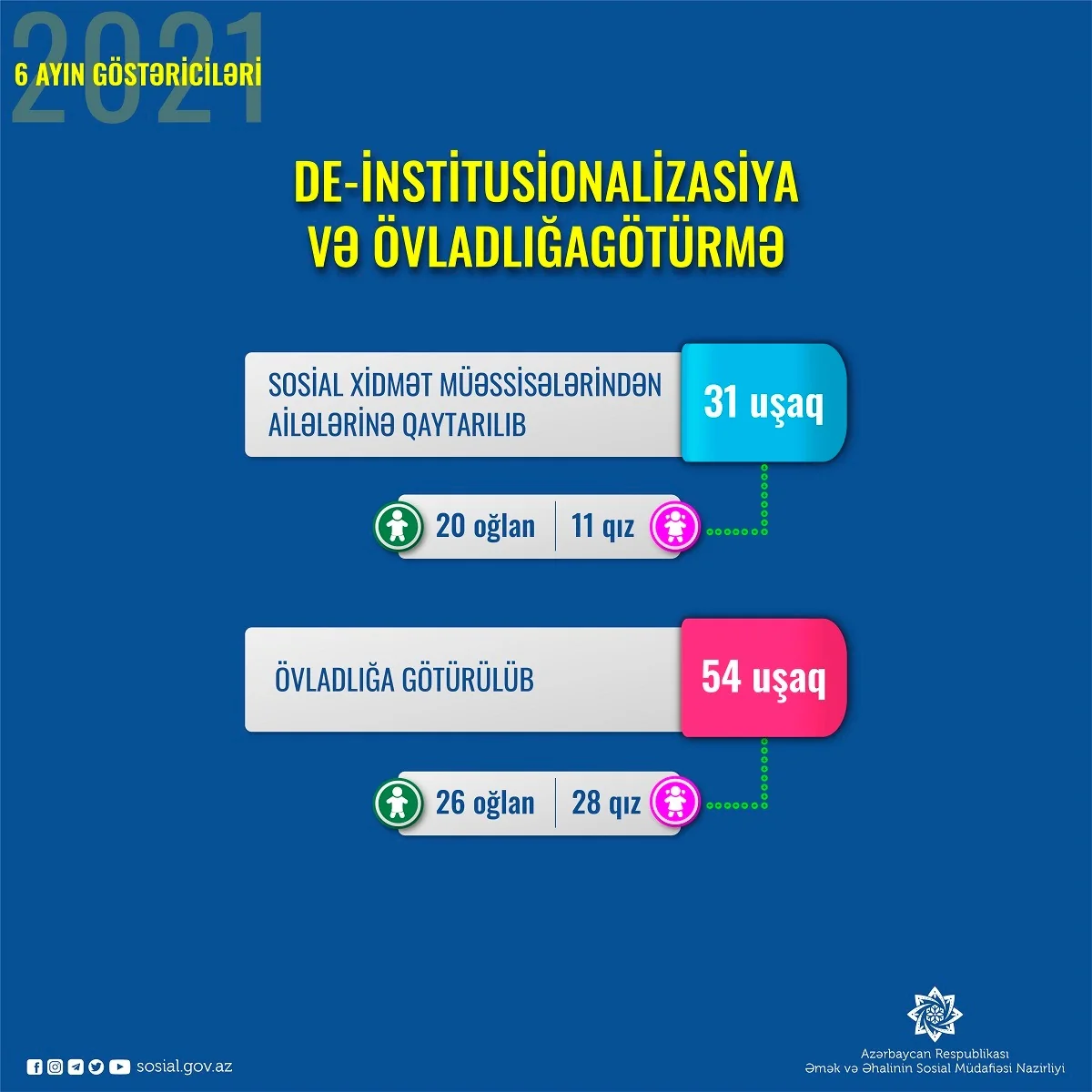 "Report" xəbər verir ki, bu müddətdə Əmək və Əhalinin Sosial Müdafiəsi Nazirliyinin sosial xidmət müəssisələrindən 31 uşaq ailələrinin istəkləri əsasında yenidən doğma ailələrinə qaytarılıb, onlardan 11-i qız, 20-si oğlandır.