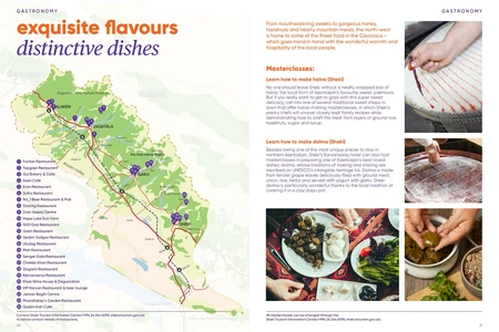 Broşürdə "Şəki Destinasiya Menecmenti" Təşkilatının fəaliyyət dairəsini əhatə edən Şəki, Qax, Zaqatala, Balakən rayonları üzrə mədəni-tarixi abidələr, təbiət gözəllikləri, piknik və gəzinti yerləri, mətbəx nümunələri, sənətkarlıq emalatxanaları, səyahət edərkən istifadə edilən nəqliyyat növləri haqda ətraflı məlumatlar əksini tapıb.
