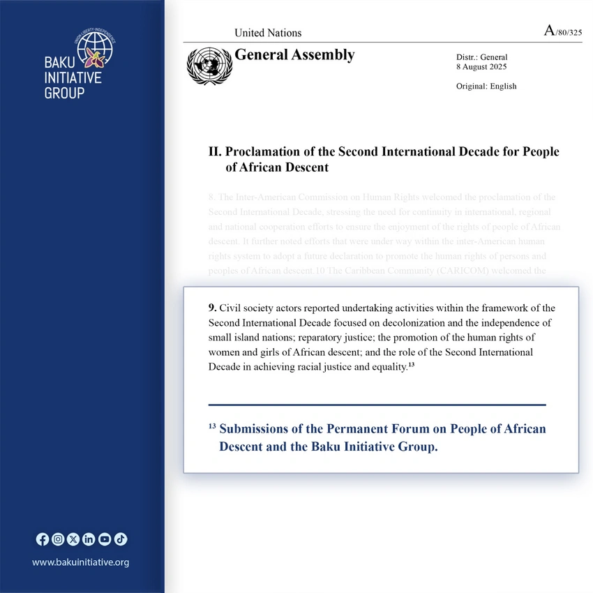 Bakı Təşəbbüs Qrupunun (BTQ) hesabatı BMT Baş katibinin 2025-ci il üzrə təqdim etdiyi "Afrika mənşəli insanların beynəlxalq ikinci onilliyinin həyata keçirilməsi üzrə fəaliyyət proqramı"na dair məruzədə qeyd olunub.