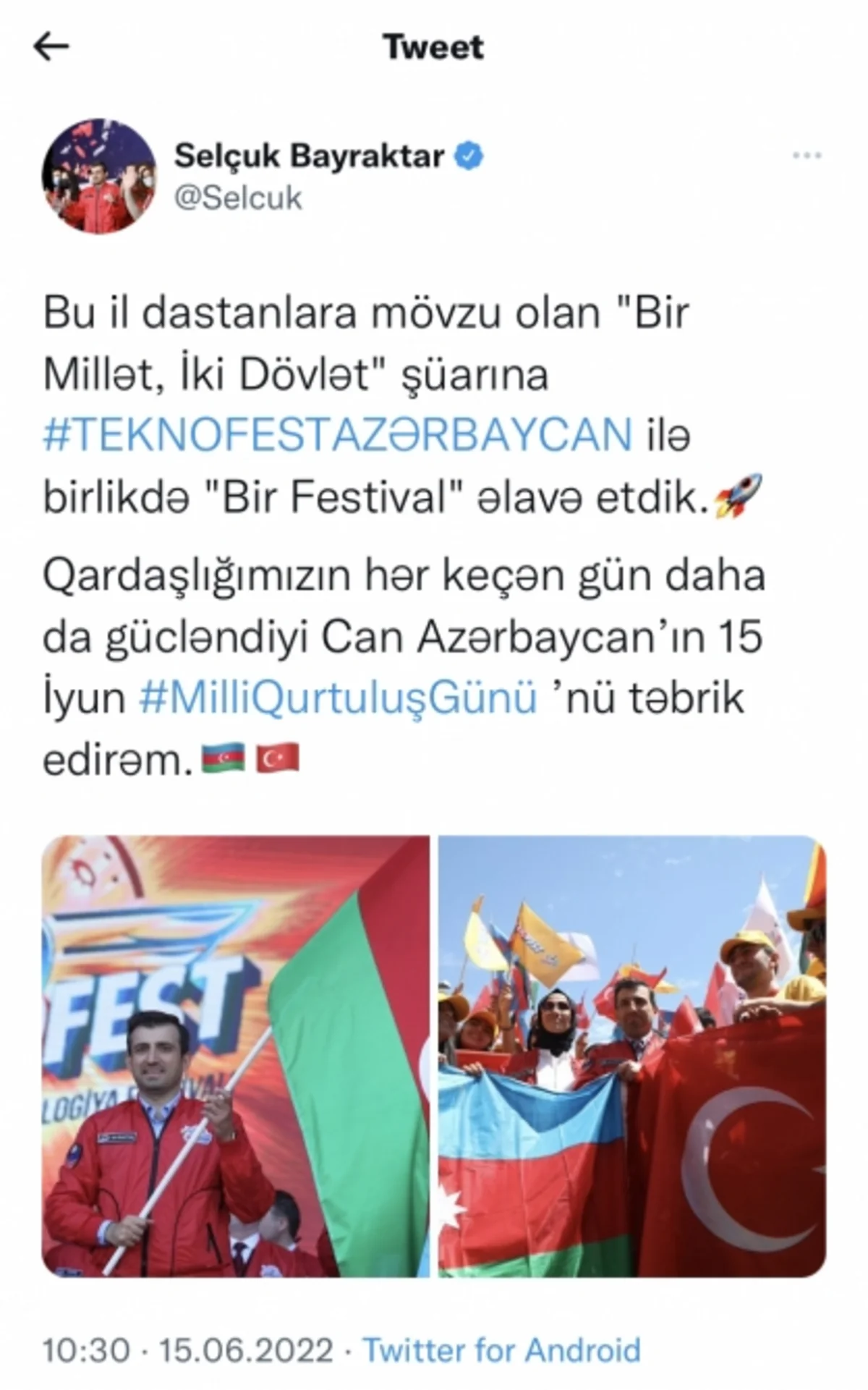 Azərbaycan və Türkiyə bayraqları ilə edilən paylaşımda deyilir: “Bu il dastanlara mövzu olan "Bir millət, iki dövlət" şüarına #TEKNOFESTAZƏRBAYCAN ilə birlikdə "Bir Festival" əlavə etdik.