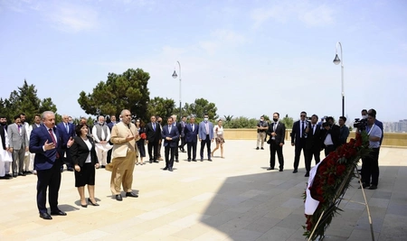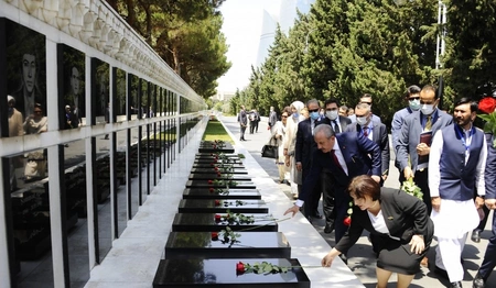 Sonra Şəhidlər xiyabanına gələn qonaqlar Azərbaycanın müstəqilliyi və ərazi bütövlüyü uğrunda şəhid olan qəhrəman Vətən övladlarının xatirəsinə ehtiramlarını bildirib, məzarları üzərinə gül dəstələri düzüb, “Əbədi məşəl” abidəsinin önünə əklil qoyublar.